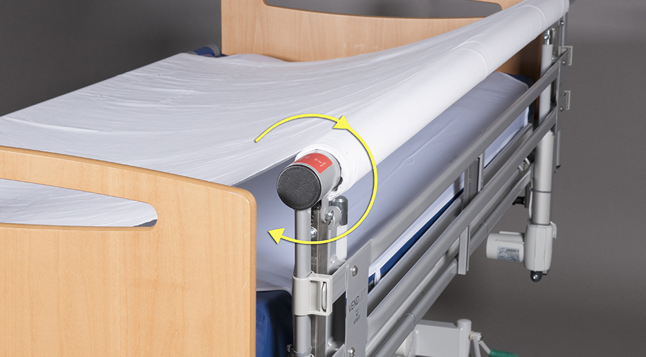 Het wentellaken wordt als een gewoon laken behandeld. en kan zo vaak als nodig worden verschoond. Wanneer het wentellaken moet worden verschoond, wordt deze eenvoudig door de rolbuizen met behulp van de handbediening gelost en kan het laken van de banden met klittenband worden getrokken. Vervolgens wordt een nieuw wentellaken aangebracht voordat het VENDLET-systeem weer in gebruik kan worden genomen.